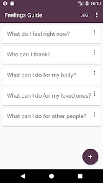 يقدم التطبيق أسئلة مدمجة لمساعدتك في الإجابة على أسئلة محددة تتعلق بمشاعرك. يمكنك أيضًا عرض سجل الإجابات الكامل وسجل لكل سؤال على حدة. واجهة المستخدم سهلة الاستخدام، مما يتيح لك إضافة وتعديل وحذف الأسئلة بسهولة.
